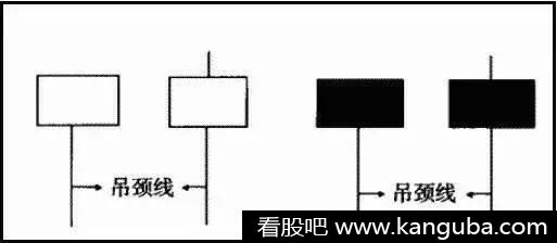 吊颈线:股价在经过一轮拉升后,在高位出现一条长下影线、小实体的图线(不分阴阳),就称之为吊颈线。大家看看下图估计会比较好理解: