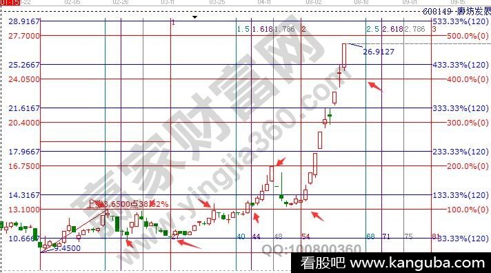 在图中:竖线是黄金时间周期线;横线是波段百分比延伸线。在历史周期中,两个周期的走势呈现对称对称性,在竖线0.5(1.5的)的时候都是遇到压力回调;0.618(1.618)的时间都是低点遇到支撑继续上涨;同样的在0.786(1.786)的时间这股票是与压力回调;这是不是很让你惊奇?这就是江恩的时间周期分析找出来的规律;现在这股票处于27.7位置的压力位置之下,下一个时间窗是8月19日,在这个时间之前,趋势不变,依然可以持股。