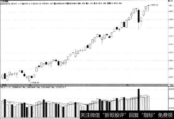 第一根K线为承接前期上升走势的大阳线,买盘强劲,显示升势持续。