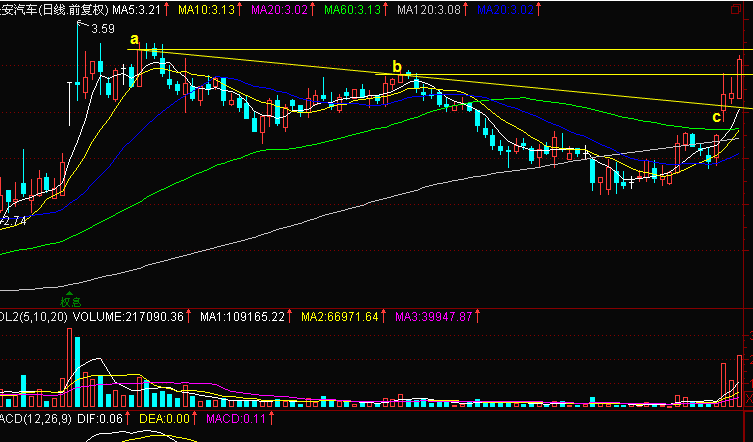图中个股在c处有一个跳空缺口,跳空就是一个兴奋,就是一段行情的起点,跳空背后总隐藏着一个故事,什么故事啊?就是这个股票有人开过会了,要把它搞上去了,所以就有人来急吼吼地打进。一个兴奋就是一个缺口,这个缺口要保护住,三天之内不能回下来,那才是一个有效的缺口,或者说是一个有效的突破缺口,回下来那就不行,假的。