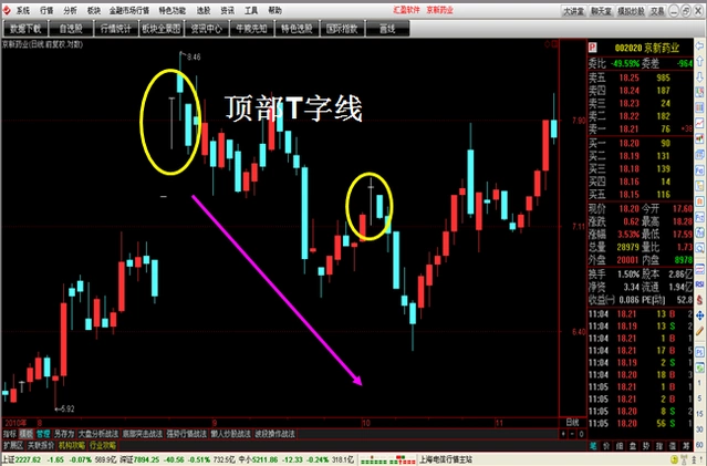 转跌为升的讯号,后市可能持续上升。多方实力胜于空方,在牛市中出现,可能续涨,在熊市中出现,可能反弹。 倒T字型 (空胜线) 表示卖方实力胜于买方,是强烈下跌的讯号。在牛市行情中出现,可能下跌;在熊市行情中出现,可能持续下跌。