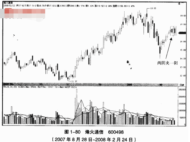 (1)两阴夹- -阳由3根K线组成。第一根K线和第三根K线为阴线,第二根K线为阳线。见图1-77。