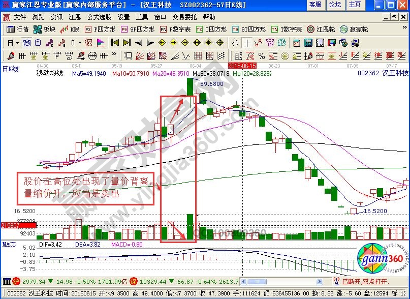 1.在高位,当出现量缩价升的时候,就应该卖出股票,如果是放量价跌当然是卖出股票!如下面的汉王科技。