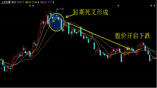 短期MA死亡交叉即5日线向下穿过10日线、20日线,即周期较短的均线下穿周期较长的均线,中长期MA死亡交叉依次类推。
