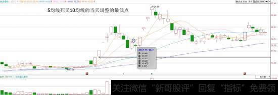 如图:韩建山河在2017.4.25,5均线死叉10均线。注意10均线并没有向下拐头。5均线死叉10均线后,未来两天没有创新低,并且在第二天突破死叉当天K线的高点。此时买入,可以赚到后面丰富的利润。