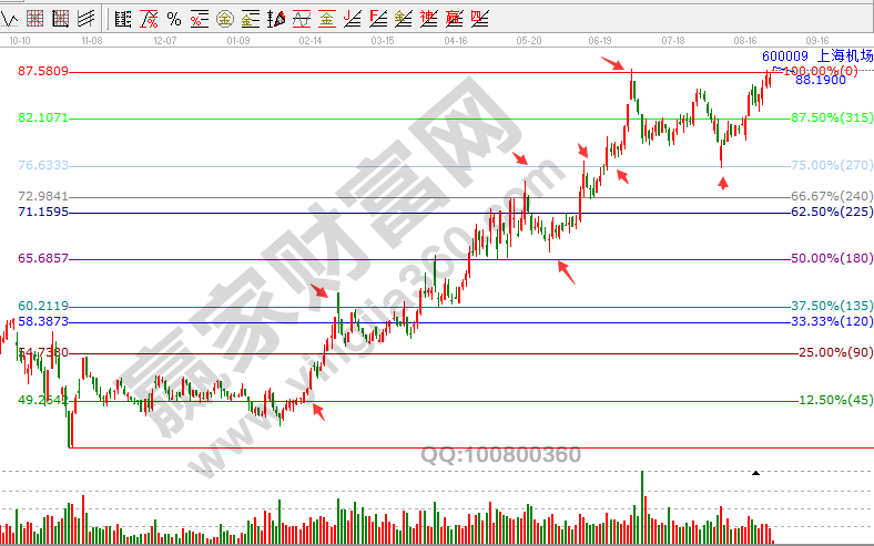和二线蓝筹股对应的是一线蓝筹股,在具体进行选取的时候没有明确说这些股票就是一线蓝筹股还是二线蓝筹股,有的是认为这个是一线,而有的人则是认为这个是二线。不过在实际操作中,对于一线来说,都是默认这些股票的在业绩稳定、流通盘以及总股本上都是比较大,在指数权重比较大的股票,通常这些股票的股票价格都不是很高,买入的时候操作的比较好。当然这些股票都比较眼熟,比如万科A000002、中国石化600028、中国联通600050、工商银行601398等等。而二线蓝筹股则是从流通股以及总股本上说不如前面这些股的同行业的股票,股价相对来说有点高,这些股也比较受到主力资金的喜爱。比如苏宁易购002024、上海机场600009、万华化学600309等。比如下图上海机场的走势图形可以看到,股价已经进入比较高的位置。之前做过绩优蓝筹股的介绍,可以一块学习。