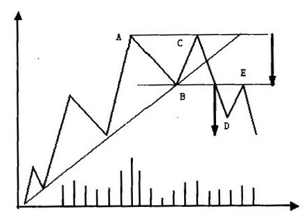M头预示上升趋势的末端,股价方向将要发生转折性的变化。从图中可以看出H头的图形特点为:某只股票股价拉升到A点时,受到阻力回落,但是得到上升趋势线的支撑,在B点重新上升至C点(与A点几乎等高,但成交量没有A点时大),遇到阻力股价再次下落。在图上通过B点做AC连线的平行线,得到颈线,而Ac连线称为趋势线。股价下跌至颈线以下,M头形态确立。