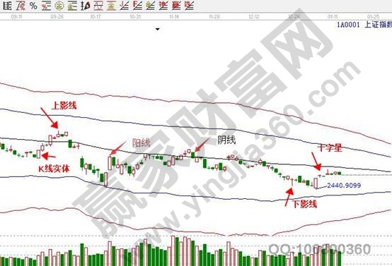 在上面的股票指数走势中可以看到,有大大小小两种K线走势:一种是红色K线;一种是绿色K线。红色K线的是阳线,表示当日为上涨走势,也就是说当天的股票指数或者股票的价格出现了上涨,如果买入这只股票就可以获取收益;绿色K线是阴线,表现当日为下跌走势,当日价格出现了下跌,买入之后就是出现亏损。而有大有小则是表示当日的价格上涨的区间较大,这个区间除了K线上面和下面的像针一样出现的影线,其他方框被称为实体,实体的大小决定K线的强弱,实体较长的阳K线表示后市还有上涨机会,较小的则无此作用;类似则是实体较长的阴K线表示后市还有继续下跌的可能。当实体没有的时候就出现了图形中十字架的K线,被称为十字星,有阴有阳,对于后市表示无方向的。除了实体之外的影线在阳线在上为上影线,在下为下影线,无论是阳线还是阴线都是上影线最高价格为最高价,下影线最低价格为最低价。